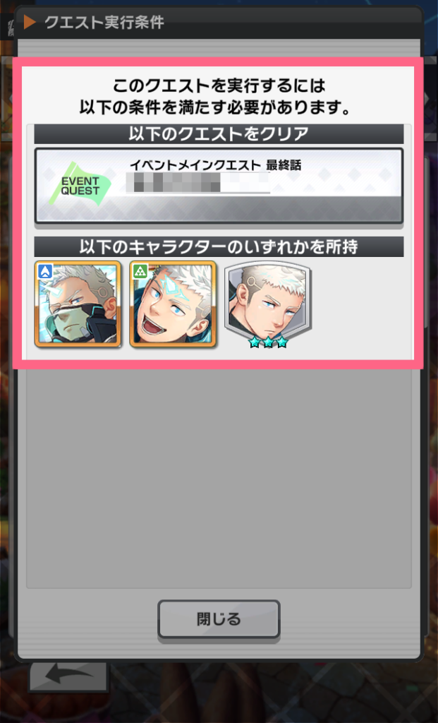 「ガイウス」のエピローグクエストの場合、「威風のガイウス(ヒーロー)」「ガイウス(ヒーロー)」「ガイウス(サイドキック)」のいずれかを所持していることで、キャラクター所持の条件は達成となります。