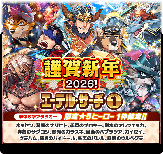 ※同時に開催されている「ホワイトアウト・リベレーションエーテル・サーチ」または「新春!ほろ酔いヒーロー訪問記エーテル・サーチ」にて排出される以下のキャラクターは本エーテル・サーチからは排出されません。
