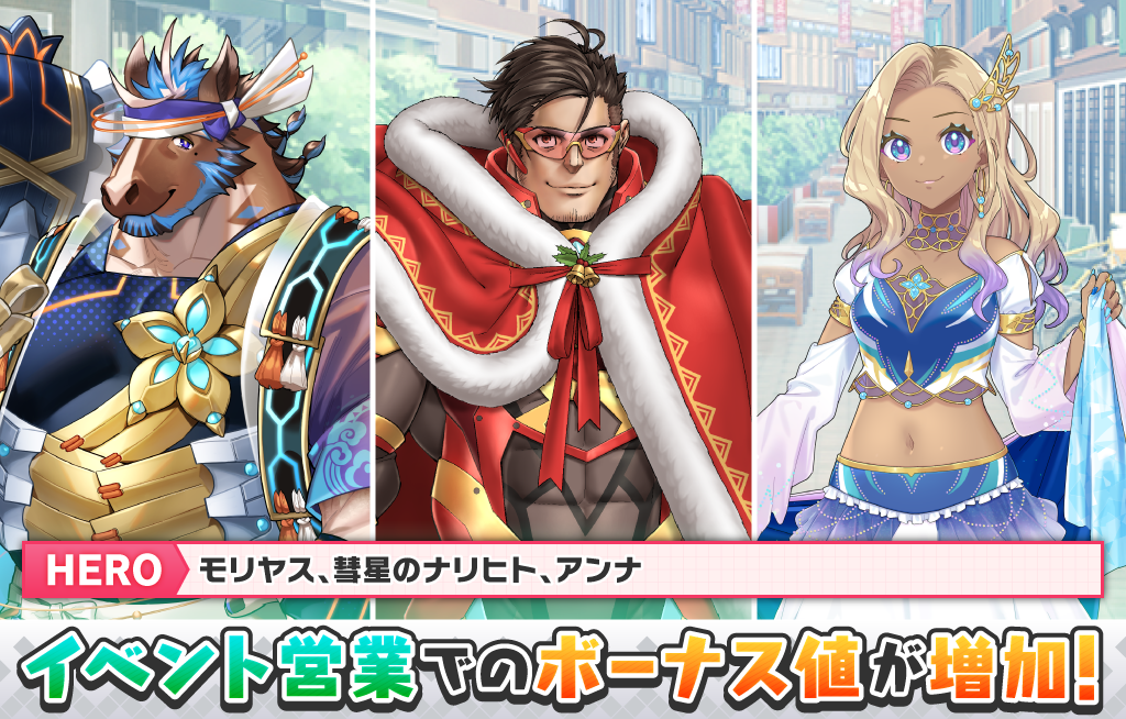 以下のキャラクターがイベント営業でのボーナス対象キャラクターとなります。対象キャラクターを営業に出発させることで、イベント営業でのボーナス値が増加します。