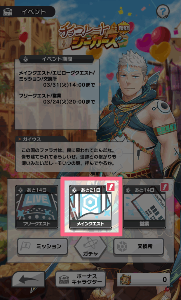 「ガイウス」のエピローグクエストの場合、「威風のガイウス(ヒーロー)」「ガイウス(ヒーロー)」「ガイウス(サイドキック)」のいずれかを所持していることで、キャラクター所持の条件は達成となります。