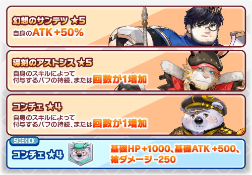 | サイドキック | コンチェ | 基礎HP+1000&基礎ATK+500&被ダメージ-250 |
